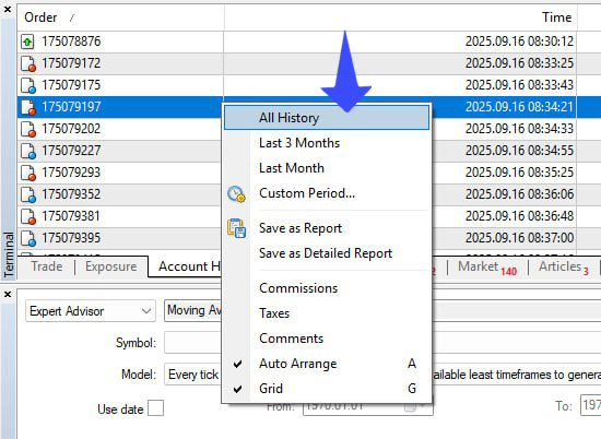 Step 4: Right-click inside the account history tab and select the time range you want to import trades from. If you want your full trading history, click on All History.