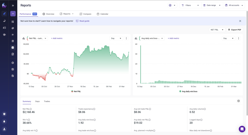 Zella’s report suite is built for the post-trade “autopsy.” They offer Trade Replay (tick-by-tick visual playback of your entries and exits), Progress Trackers (to monitor your goals), and Playbooks. Their ‘Notebook’ acts as a fully integrated trading diary, and their Zella Score provides a unique performance score based on risk-to-reward and consistency metrics.