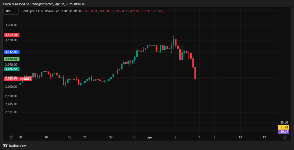 Gold (XAU) continued its decline on Friday, dropping to a seven-day low of $3,015 before recovering slightly. This decrease followed Federal Reserve Chair Jerome Powell’s saying that tariffs could reignite inflation. XAU/USD is currently trading at $3,029, down 2.70%.