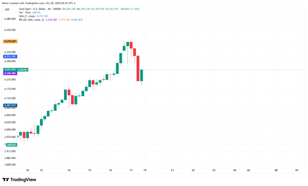 Gold price (XAU/USD) dropped 2% after hitting a record high of $4,379 earlier on Friday. Prices fell below $4,250 following US President Donald Trump’s comment that high tariffs on China are not sustainable. As of now, gold prices are around $4,230 to $4,240.