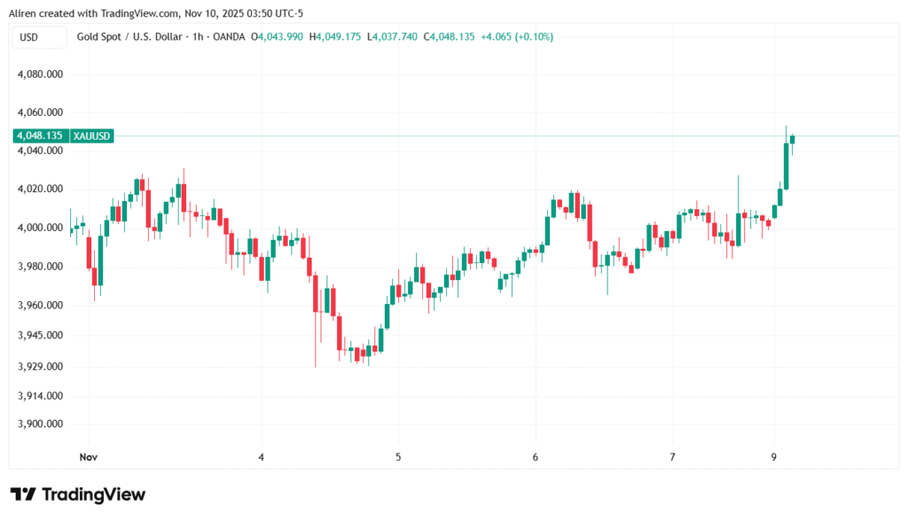 Spot gold started the week near $3,979 on Monday, dipped to roughly $3,931 on Tuesday, then recovered to close around $3,999 on Friday and about $4,063 on Sunday. That puts the week roughly +2% from Tuesday’s low and modestly higher versus Monday’s close as safe-haven bids re-emerged into the weekend.