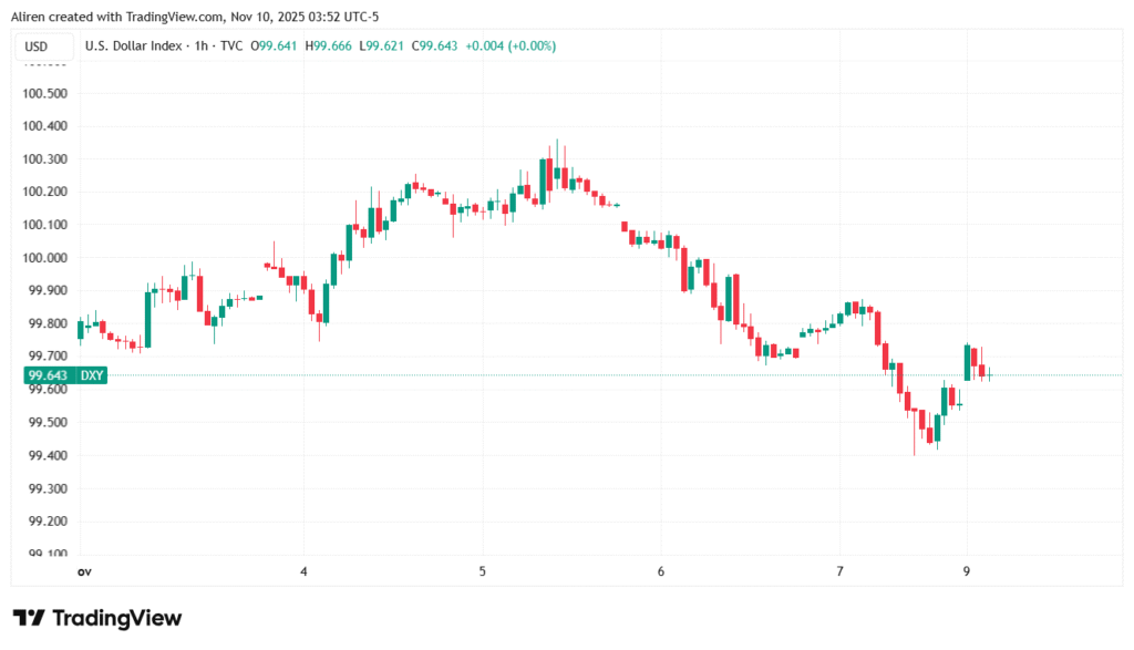 The US Dollar Index closed around 99.87 on Monday, slipped to roughly 99.60 on Friday, then was near 99.74 on Sunday. Overall, DXY held a 99.6–100.2 corridor for most of the week. On Friday the dollar firmed in Asia after softer China trade data, even as US data flow was muddied by a government shutdown delaying some official releases.