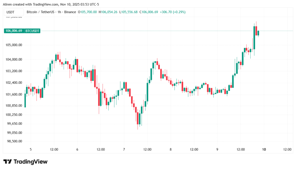 Bitcoin fell from a Monday close near $106,578 to a Tuesday close around $101,504. On Wednesday the market briefly traded sub-$100,000 intraday before rebounding, and by Friday closed near $103,325. Into Sunday, BTC firmed to about $104,722. Week on week that is modestly lower versus Monday but off the midweek lows.