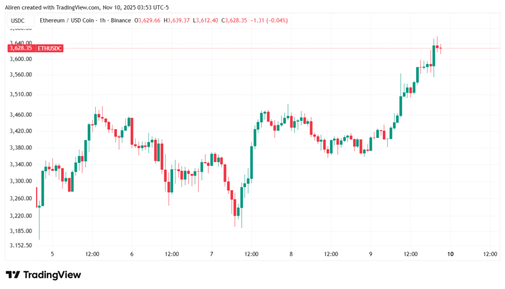 ETH closed Monday near $3,604 after a sharp drop, fell further to roughly $3,289 on Tuesday, then recovered through Friday around $3,436 and Sunday near $3,584. The pattern was a V-shape from the $3,06x–$3,20x intraday zone back toward the mid-$3,500s.