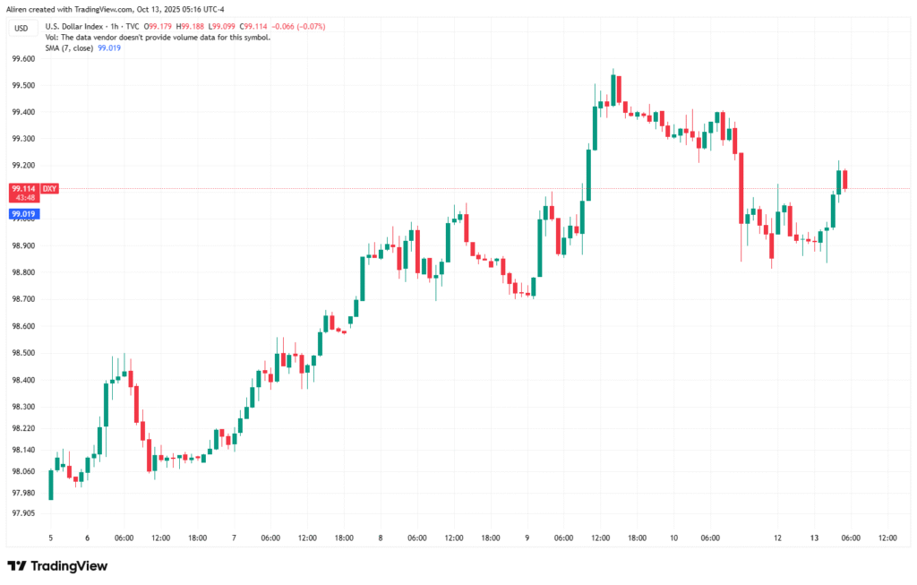 Short-term support lies near 98.8–98.5 (recent swing lows). If that breaks, DXY could gravitate toward 98.0. On the upside, resistance clusters at 99.5–100.0. Until the dollar reclaims the upper resistance band, the broader bias leans mildly bearish. Persistence above 100 would be needed to validate a reversal in trend.