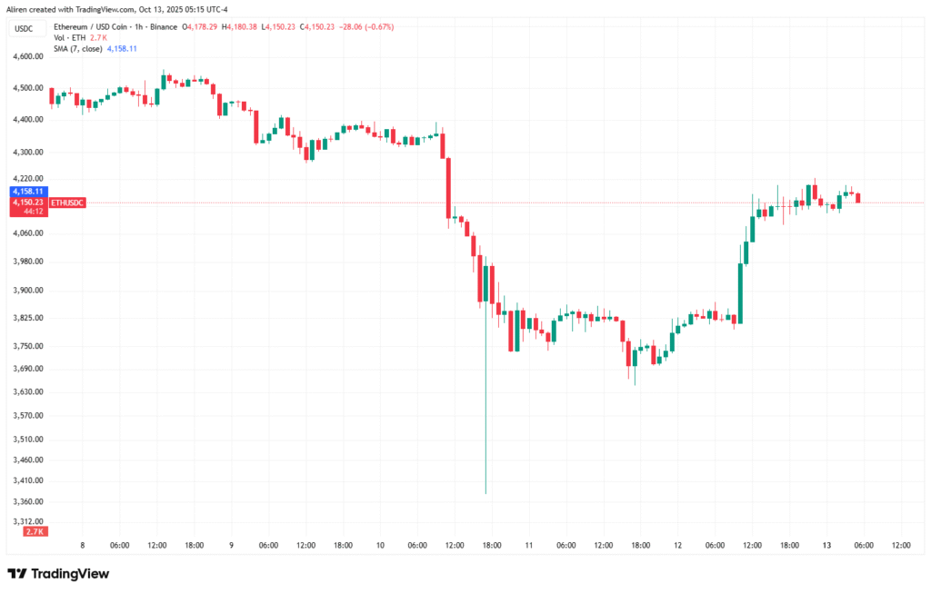 Ethereum followed in BTC’s footsteps — downside early in the week, then bid support near critical levels. The slide under $4,000 shook out weaker positioners, but ETH managed to claw back ground as the week progressed, attempting to reassert strength.